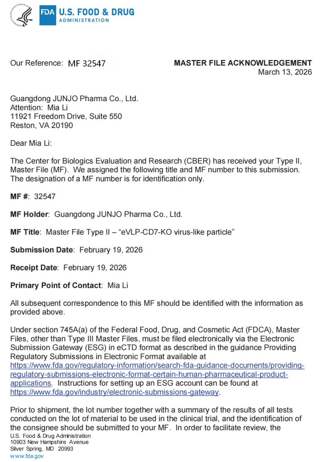 近期,乐天堂fun88集团在细胞与基因治疗核心技术国际化方面取得重要里程碑进展。集团全资子公司广东君厚生物医药有限公司自主研发的 “eVLP-CD7-KO virus-like particle(CD7基因敲除工程化类病毒颗粒)” 已正式完成美国食品药品监督管理局(FDA)Drug Master File(DMF)备案,备案号 MF 32547,并取得美国 FDA 生物制品评估与研究中心(CBER)受理确认。