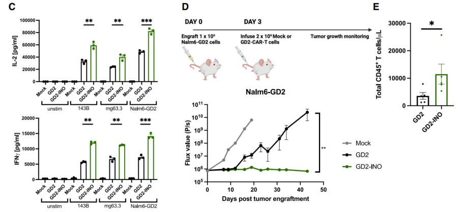最后,研究人员尝试了用含INO的培养基大规模生产临床级CAR-T细胞,发现INO组与对照组在转导效率、细胞活性和CD4/CD8比例方面均无显著差别,虽然细胞增殖受到一定抑制,但仍可满足临床要求,且幼稚T细胞和记忆T细胞的比例更高,分泌更多IL-2和IFN-γ,并且在小鼠体内表现出更强、更持久的抗肿瘤能力。