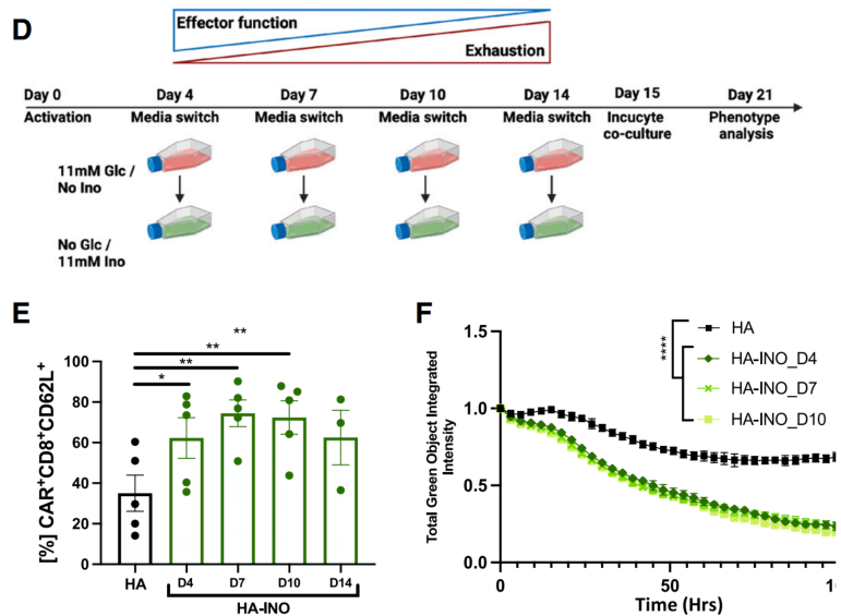 相较之下,顺利获得表达锚定的腺苷脱氢酶(ADA)—将Ado代谢为肌苷(INO),则可以显著提升CAR-T细胞的干性,且耗竭相关基因下调。而在培养过程中添加INO可以达到同样效果,且提升了CAR-T细胞的效应功能。