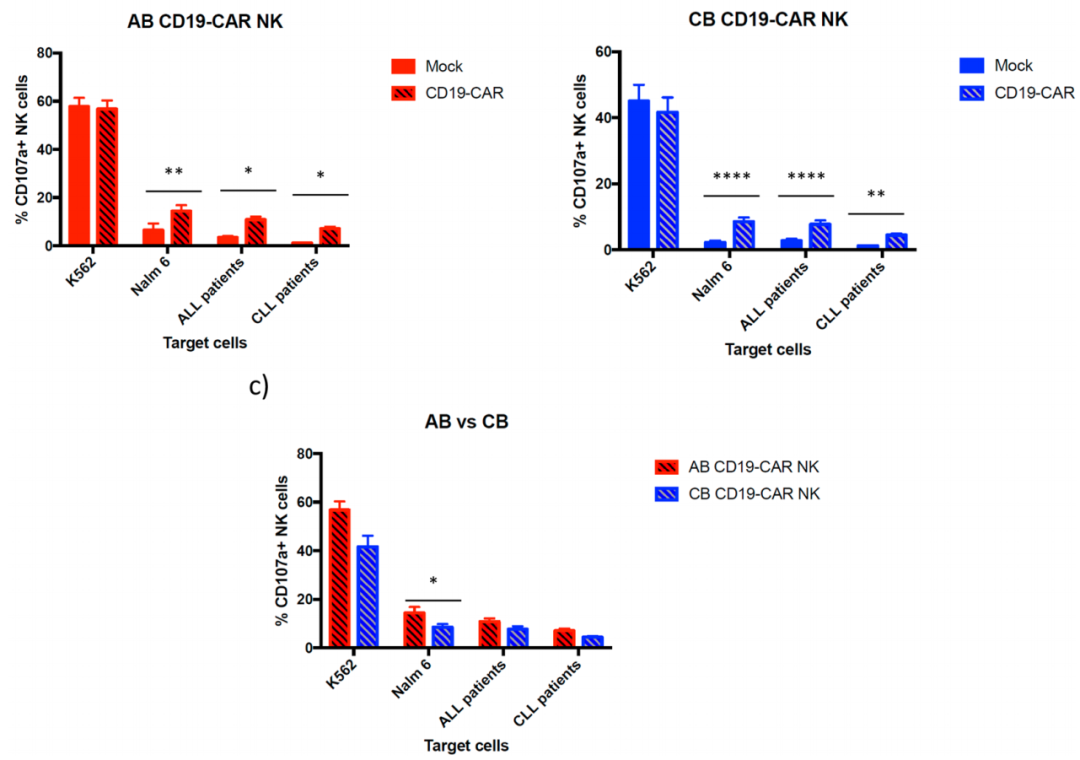 本研究检测了两种来源的非转导NK细胞和CD19 CAR-NK细胞在不同效应靶比下的细胞毒性活性。AB和CB CAR-NK细胞比未转导的NK细胞更好地裂解表达CD19的靶细胞。AB CD19 CAR-NK细胞在10:1比例杀伤Nalm-6的能力、10:1和5:1比例杀伤ALL的能力、1:1比例杀伤CLL细胞的能力显著优于CB CD19-CAR NK细胞。另一方面,在10:1和5:1的比例下,CB CD19-CAR NK细胞裂解CLL细胞的能力显著增强。总结:不管是对ALL还是CLL原代患者肿瘤细胞,AB来源CD19-CAR NK细胞杀伤能力明显优于CB来源。